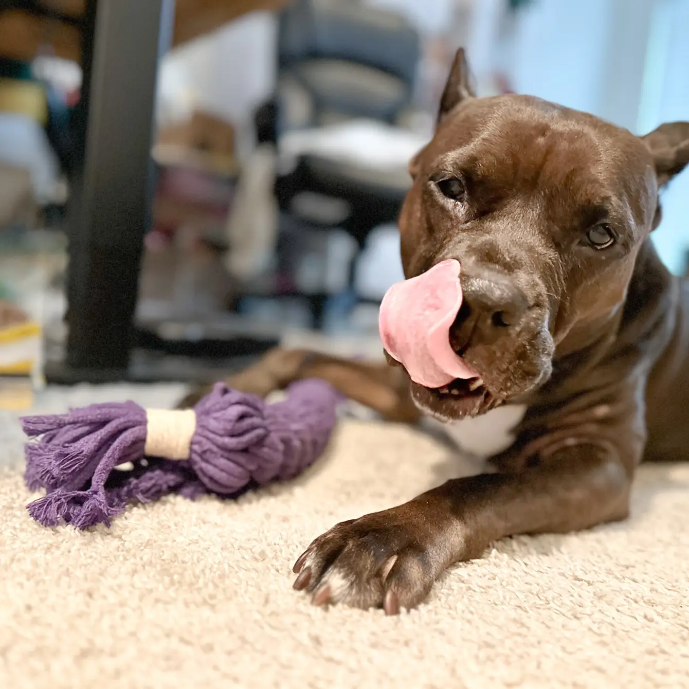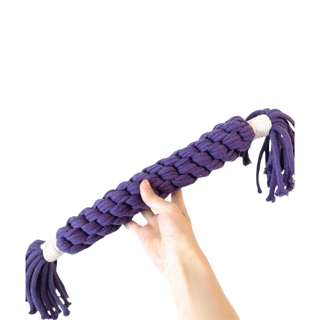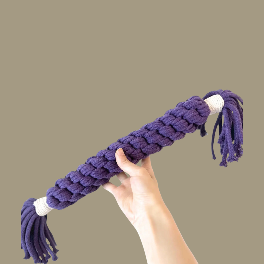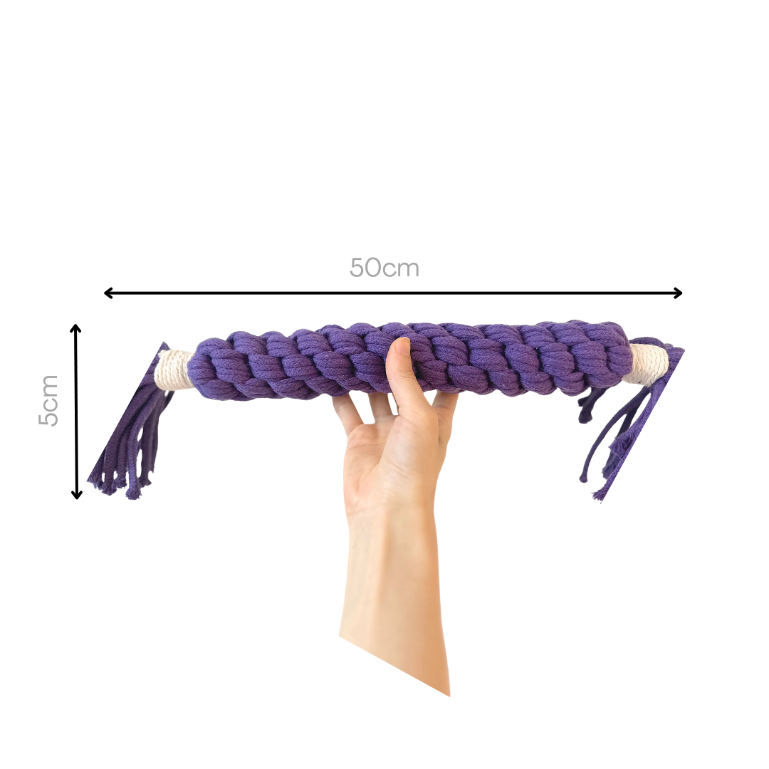 Handmade jumbo macrame rope toy for large dogs. Made from sustainable materials, this durable rope is eco-friendly. Its bright colors and strong knots make it easy to find. Natural fibers are safe for your pet and the environment. Size: 50cm x 5cm x 5cm. Weight: 310g.
